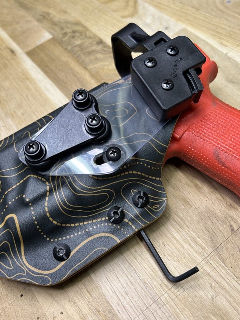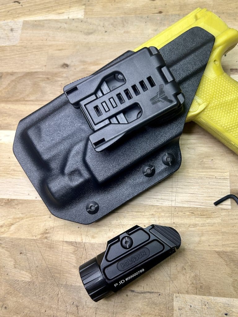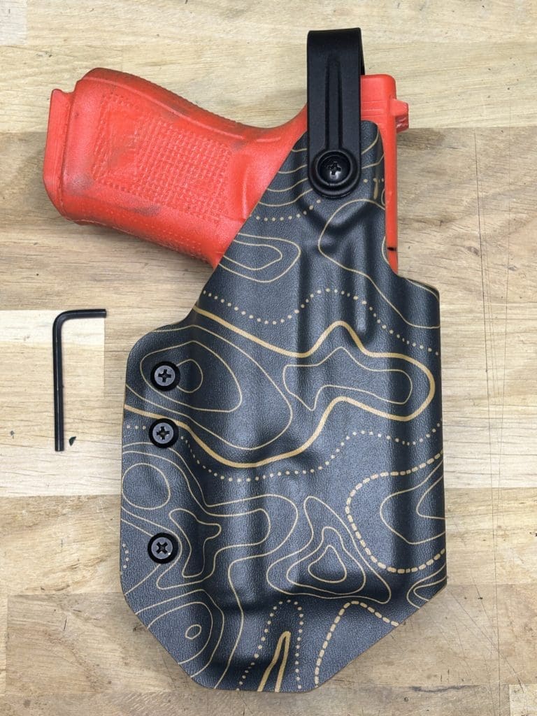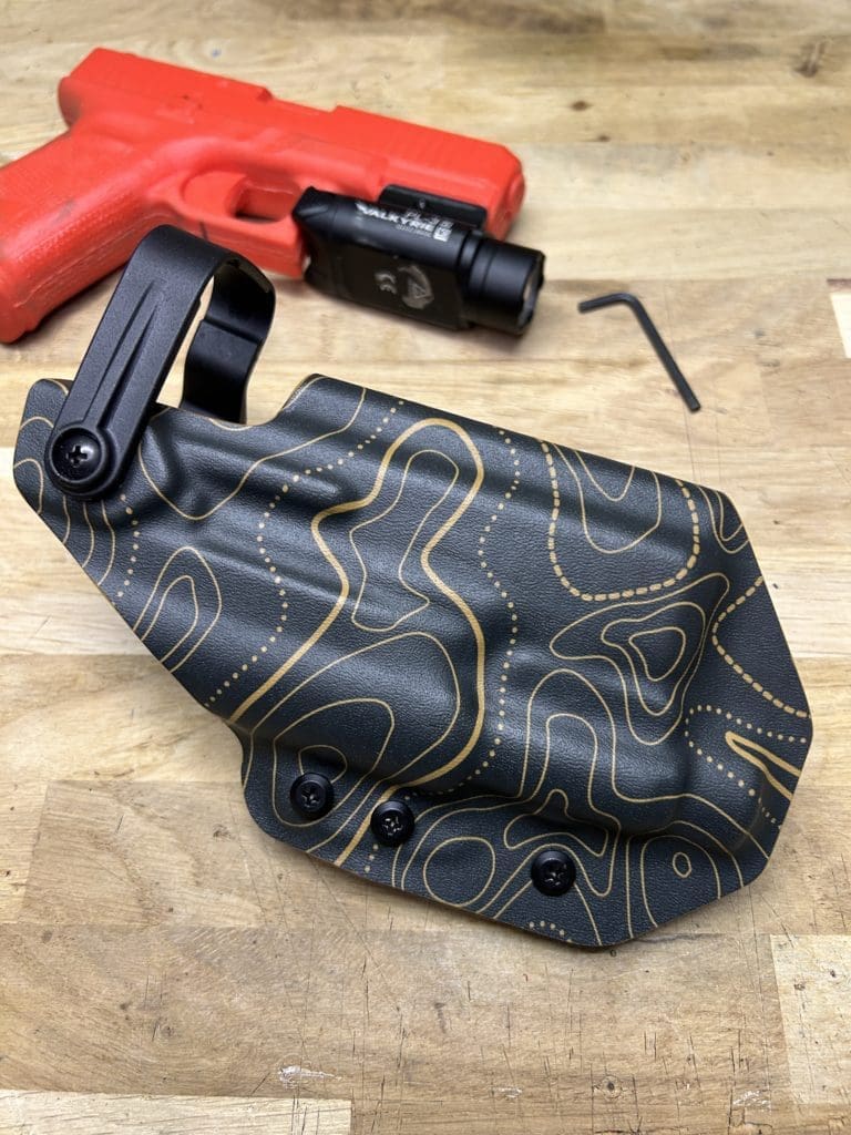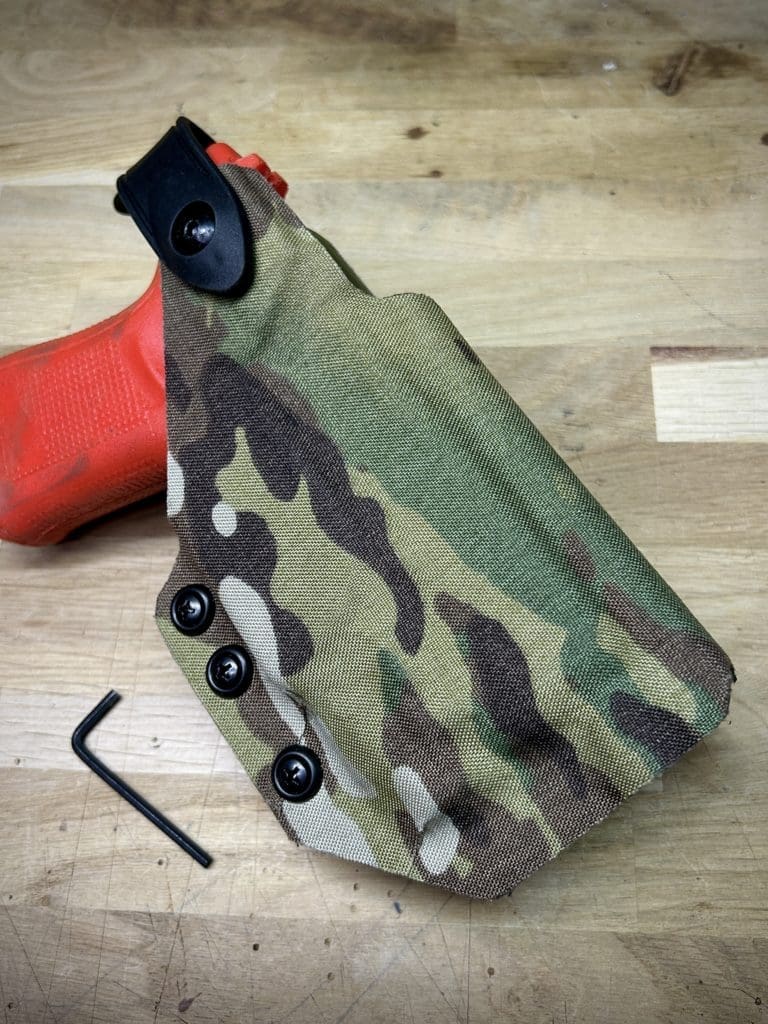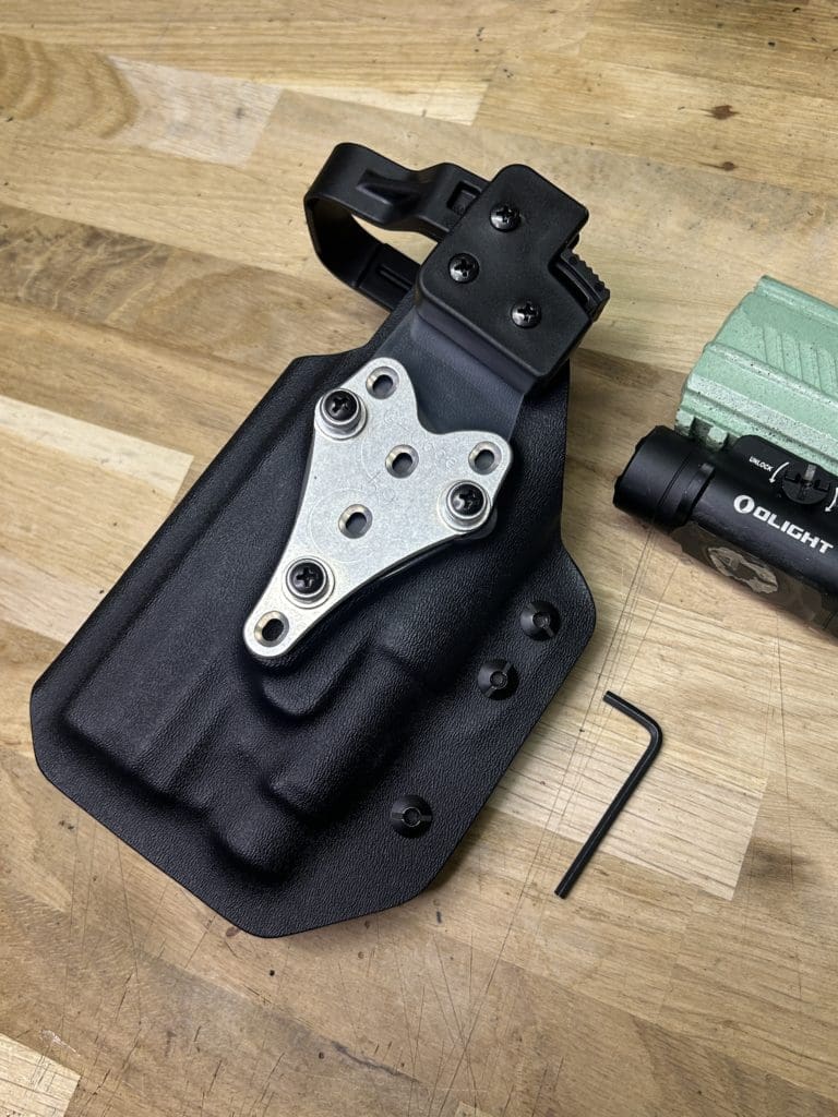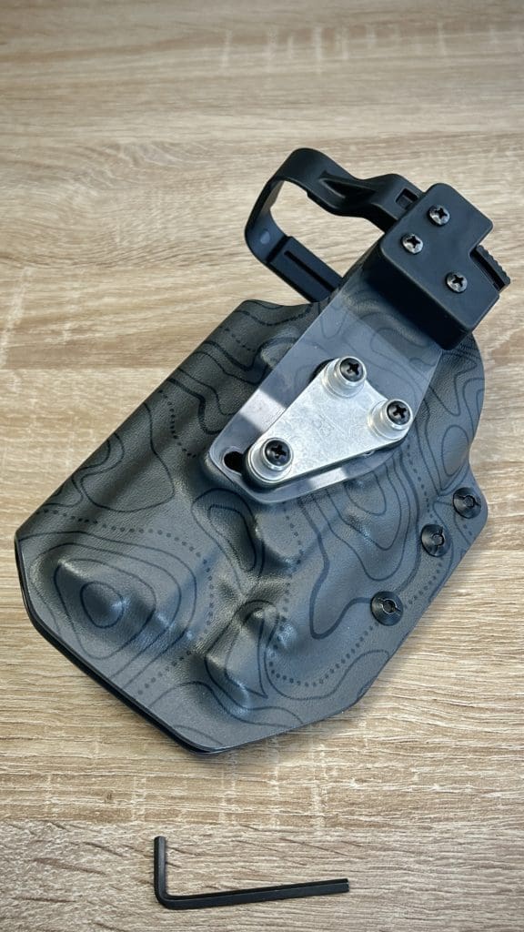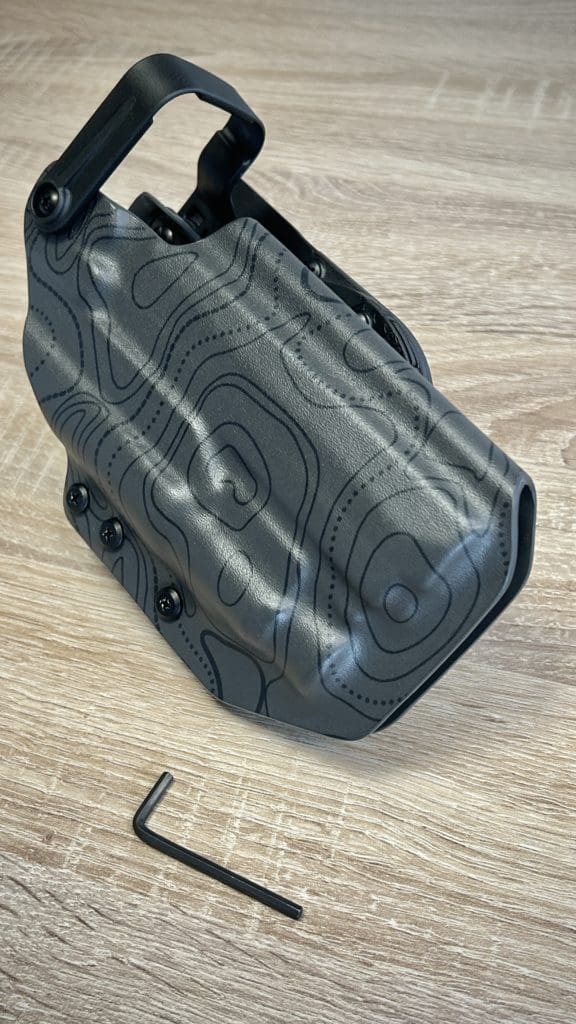 Le holster Hybride (OWB ou IWB) se distingue par sa polyvalence: il fonctionne comme un holster classique tout en offrant la possibilité d’accueillir une arme équipée OU NON d’une lampe. De plus, il intègre une rétention réglable grâce à une clé Allen, pour un ajustement optimal.