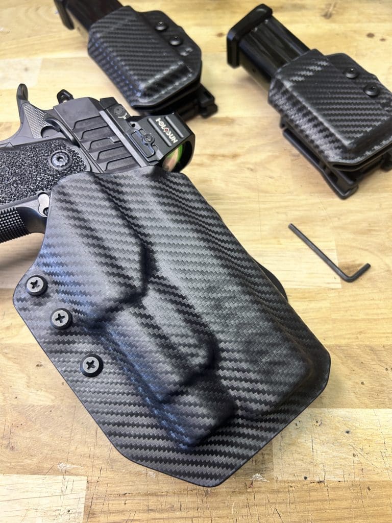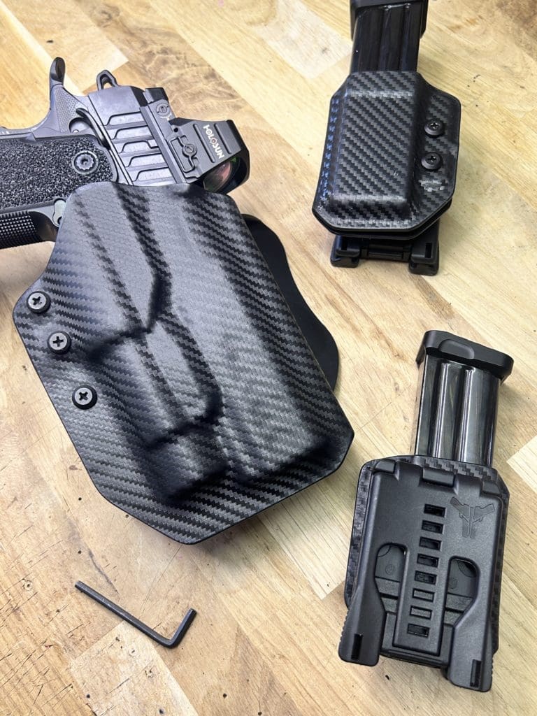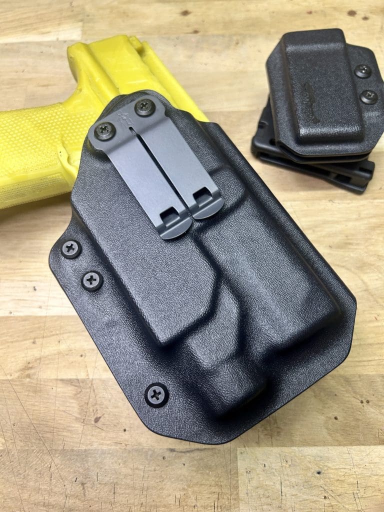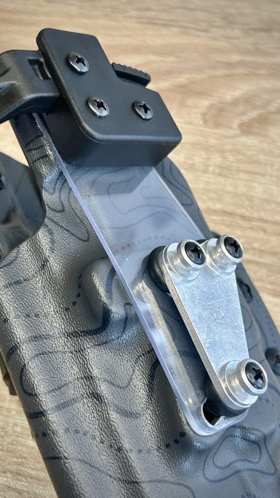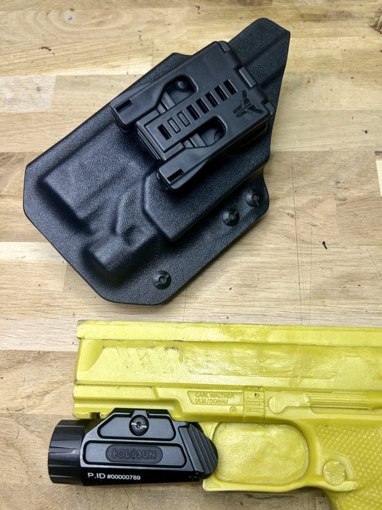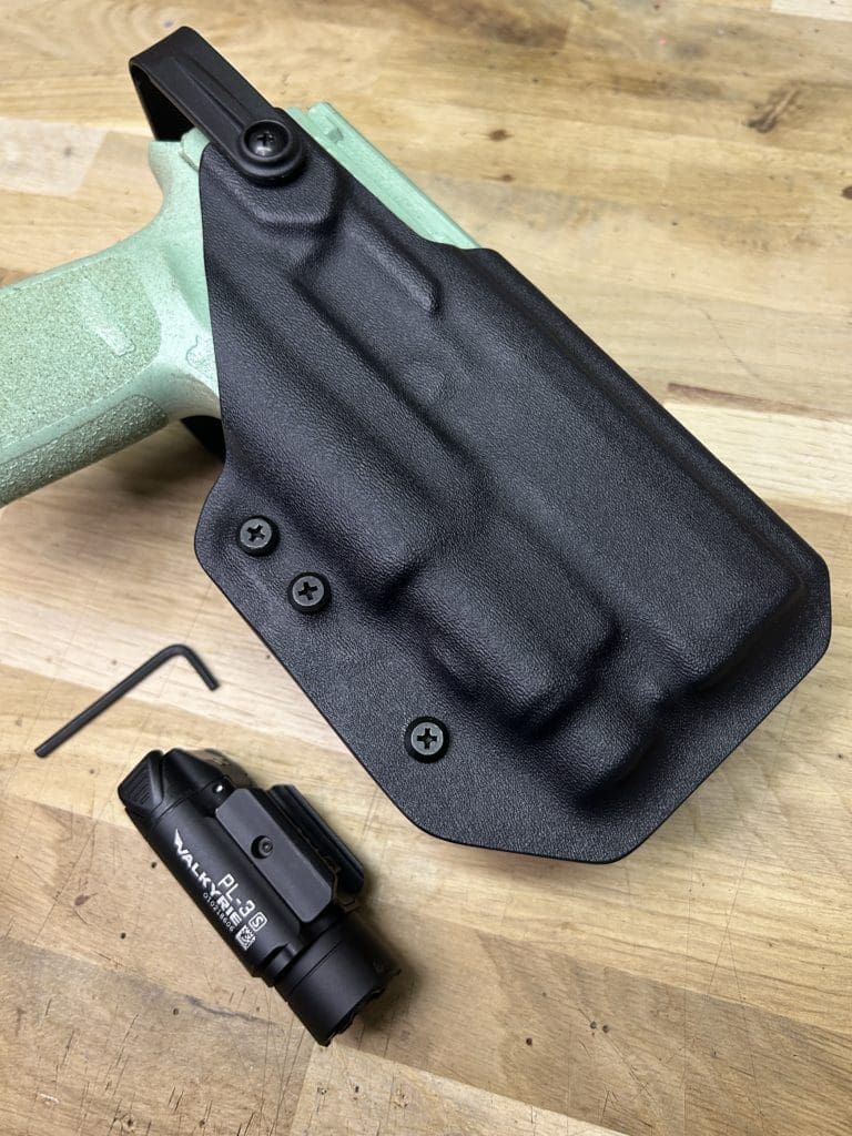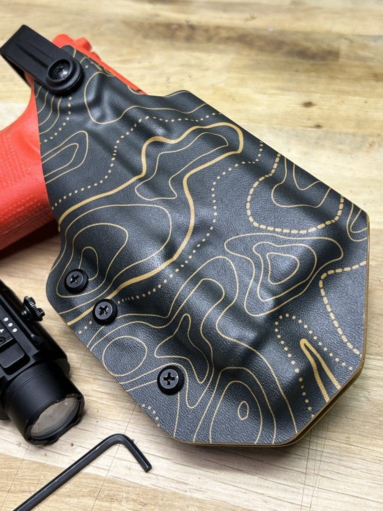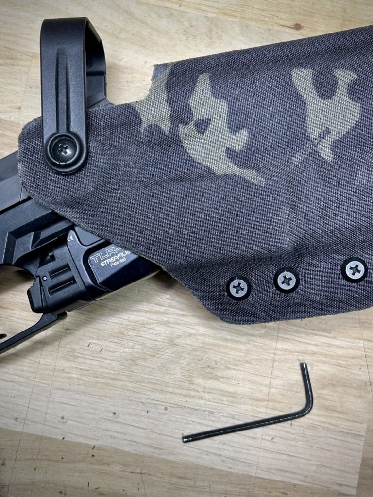 Le holster Hybride (OWB ou IWB) se distingue par sa polyvalence: il fonctionne comme un holster classique tout en offrant la possibilité d’accueillir une arme équipée OU NON d’une lampe. De plus, il intègre une rétention réglable grâce à une clé Allen, pour un ajustement optimal.