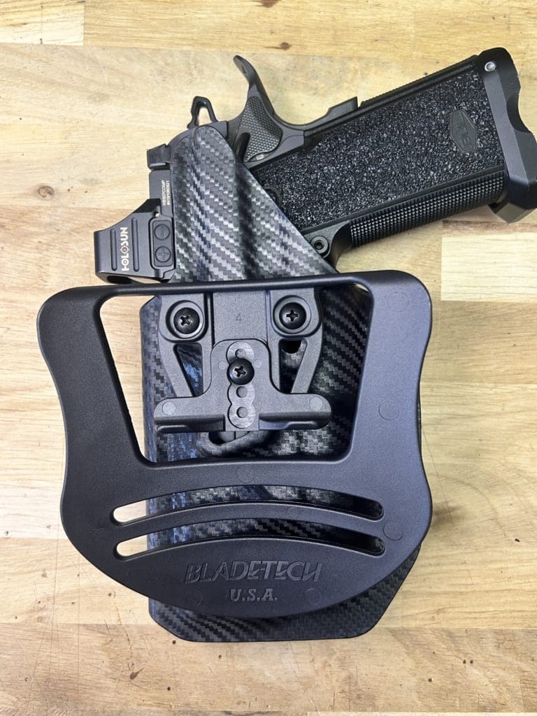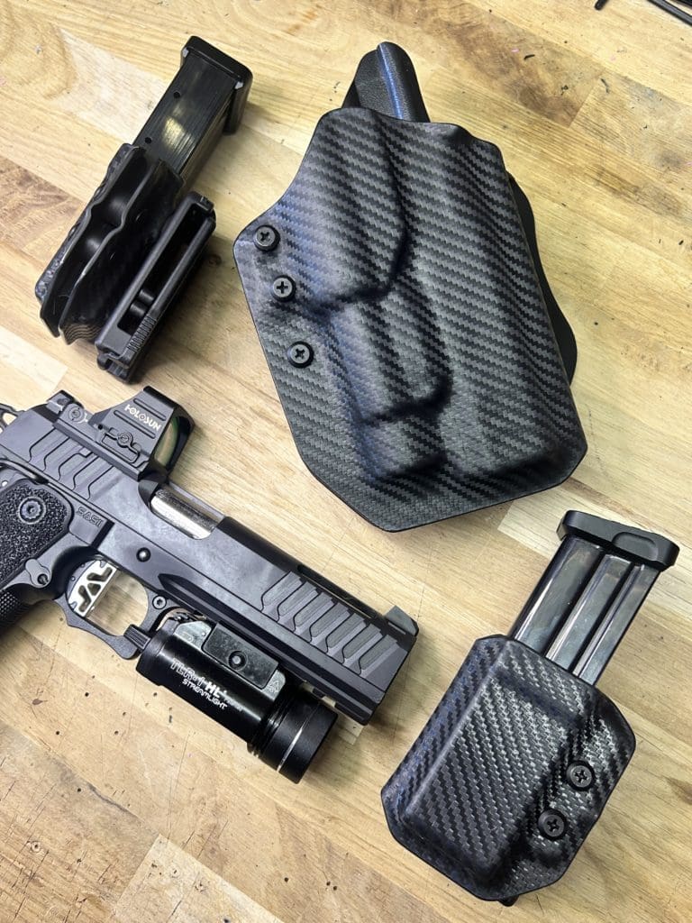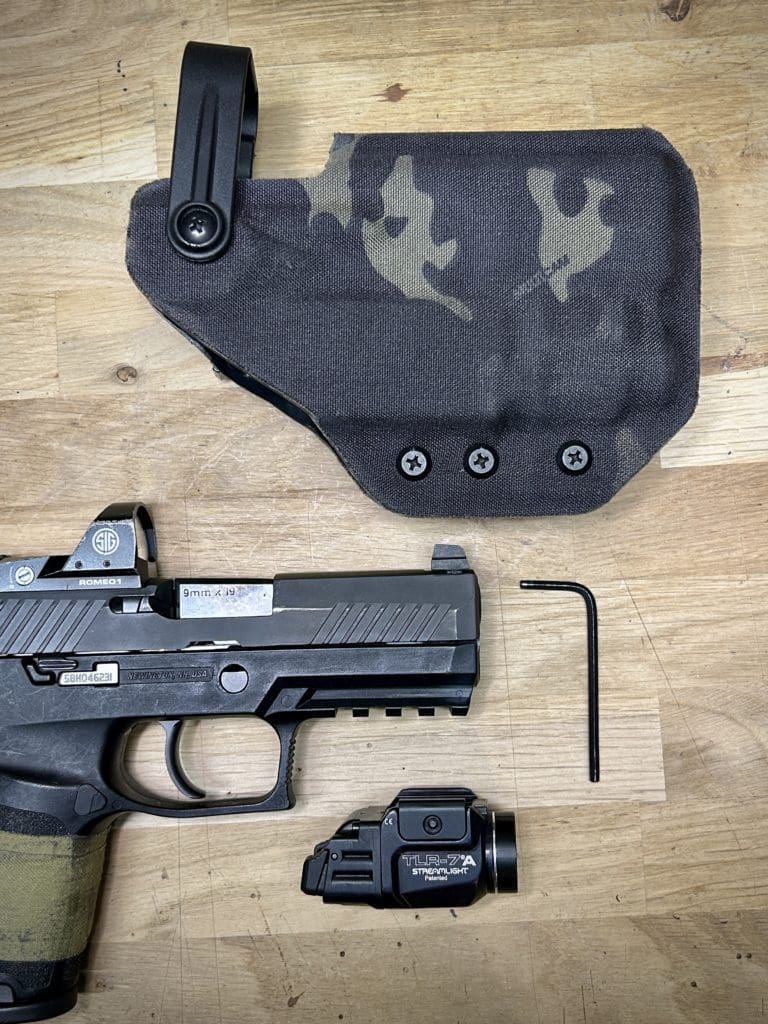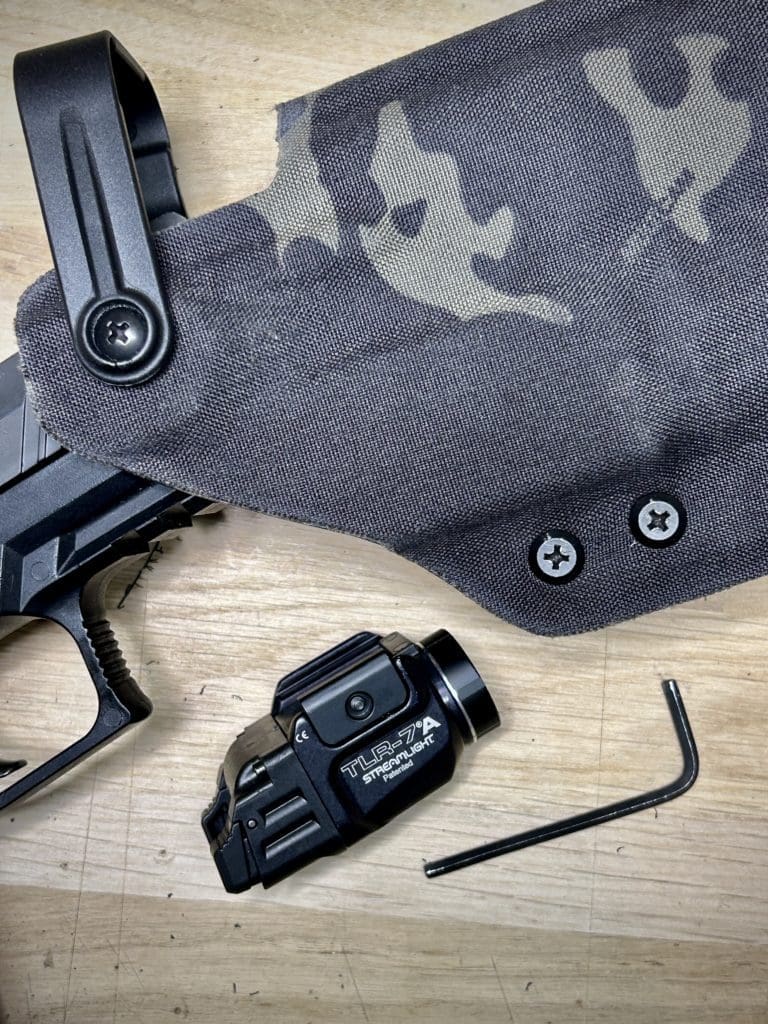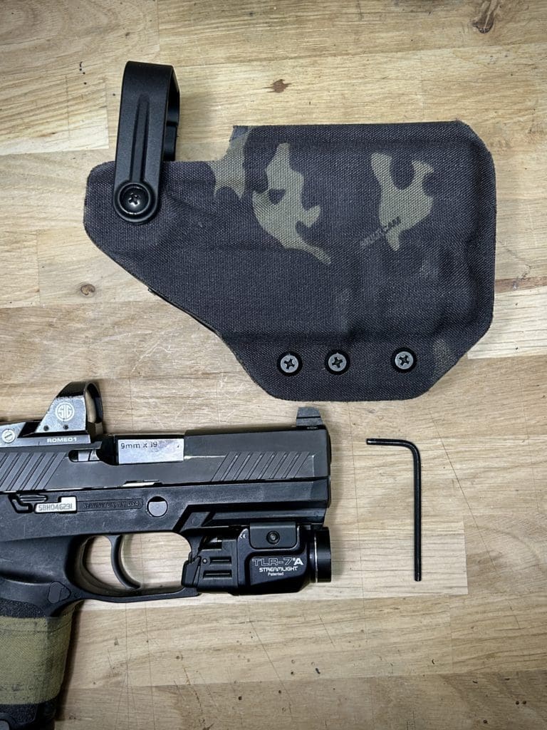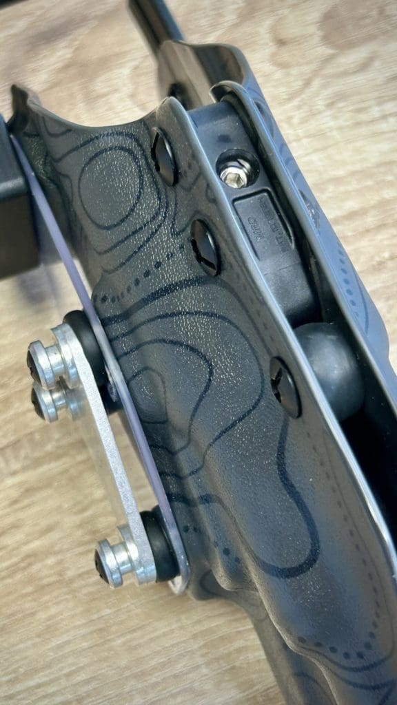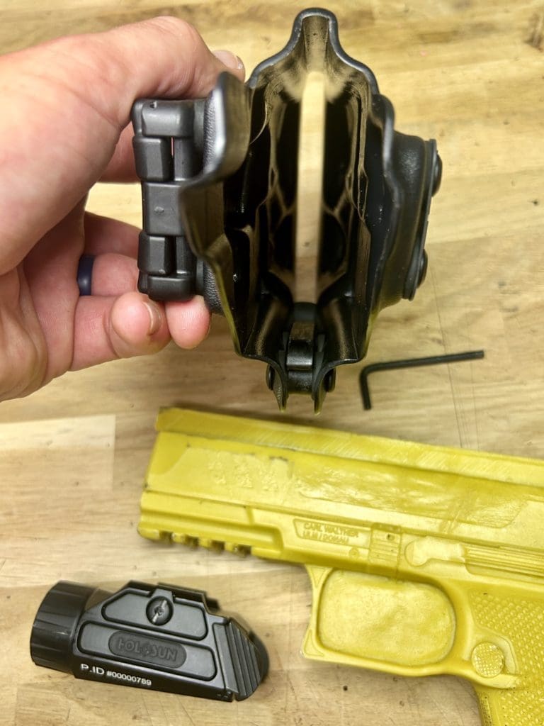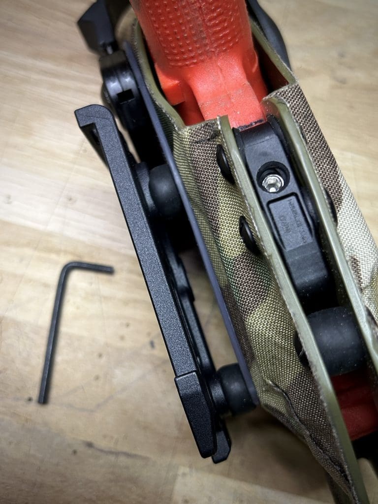 Le holster Hybride (OWB ou IWB) se distingue par sa polyvalence: il fonctionne comme un holster classique tout en offrant la possibilité d’accueillir une arme équipée OU NON d’une lampe. De plus, il intègre une rétention réglable grâce à une clé Allen, pour un ajustement optimal.